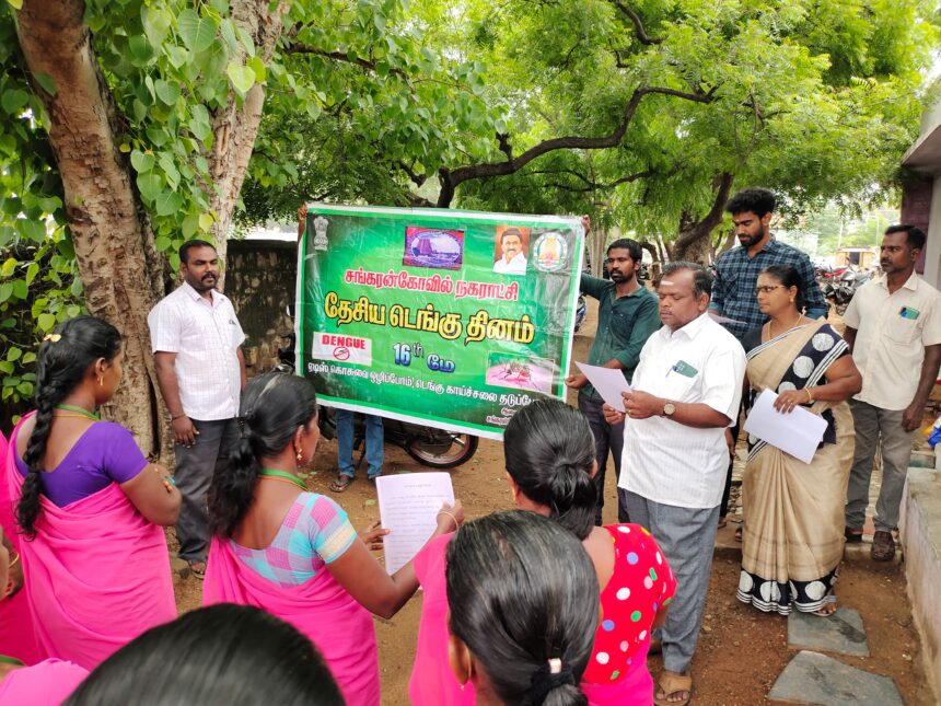 சங்கரன்கோவில் நகராட்சியில் ஏடிஎஸ் கொசு நோய் பரப்பி டெங்கு வைரஸ் காய்ச்சல் தடுப்பு விழிப்புணர்வு நிகழ்ச்சி நகர் மன்ற தலைவர் உமா மகேஸ்வரி சரவணன் ஆணையாளர் சபாநாயகம் சுகாதார அலுவலர் வெங்கட்ராமன் ஆகியோர் ஆலோசனைப்படி உறுதிமொழி ஏற்கப்பட்டது நிகழ்ச்சியில் நகரில் களப்பணிக்கு செல்லும் டெங்கு விழிப்புணர்வு பணியாளர்களுக்கு ஏடிஎஸ் கொசு வினால் டெங்கு வைரஸ் காய்ச்சல் நோய் பரப்பி மூலம் ஏற்படும் நோய்களை தடுக்கும் வகையில் சுகாதாரத்தை பேணி பாதுகாப்பது குறித்தான ஆலோசனைகள் வழங்கப்பட்டது மேலும் டெங்கு காய்ச்சல் பரவுவதை தடுக்கும் வகையில் பொது மக்களுக்கான டெங்கு நோய் தொற்று தடுப்பு நடவடிக்கைகள் மற்றும் கொசுக்கள் ஏற்படும் இடம் அதனை அழிக்கும் விதம் குறித்தும் மருத்துவ ஆலோசனை களையும் பொதுமக்களுக்கு ஆலோசனைகள் வழங்குமாறு டெங்கு பணியாளர்களுக்கு ஆலோசனைகளை ஆய்வாளர்கள் விரிவாக எடுத்துக் கூறினர் நிகழ்வில் டெங்கு காய்ச்சல் வராமல் தடுக்கும் வகையில் நடவடிக்கை மேற்கொள்வோம் என டெங்கு பணியாளர்கள் உறுதிமொழி எடுத்துக் கொண்டன ர் நிகழ்ச்சியில் டெங்கு பணியாளர்கள் மற்றும் தூய்மை இந்தியா திட்ட மேற்பார்வையாளர்கள் கலந்து கொண்டனர் ஏற்பாடுகளை சுகாதார ஆய்வாளர்கள் மாரிமுத்து மாரிச்சாமி ஆகியோர் கொண்ட குழுவினர் செய்திருந்தனர்.