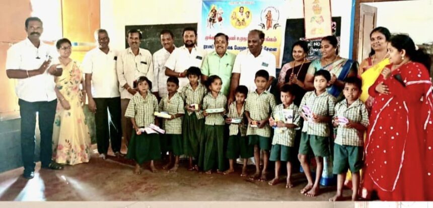 பின்னர் பள்ளி மாணவ மாணவிகளுக்கு நோட்டு புக்,பென்சில் பாக்ஸ் வழங்கப்பட்டது. மேலும் முக்குலத்து தேவர் சமுதாய நலச் சங்கம்,வேலு நாச்சியார் சேனையினர் இணைந்து ரத்ததானம் செய்தனர்.