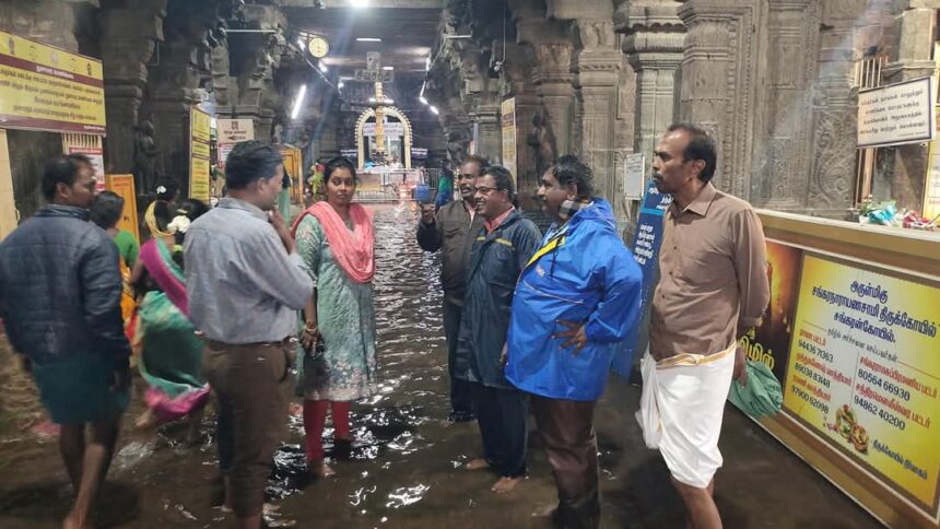 சங்கரன்கோவிலில் நேற்று முன்தினம் இரவு முதல் பெய்த கனமழையால் சங்கரன்கோவில் சங்கரநாராயண சுவாமி திருக்கோயிலில் மழைநீர் சூழ்ந்ததால் பக்தர்கள் மிகுந்த சிரமத்திற்கு உள்ளாகினர்