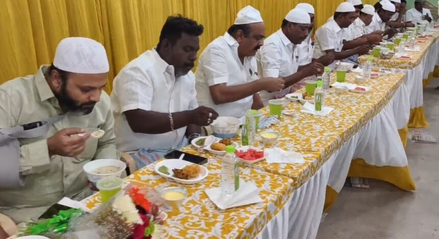 இஸ்லாமியர்களின் புனித ரமலான் மாதத்தை முன்னிட்டு சமூக நல்லி ணக்க நோன்பு திறக்கும் நிகழ்ச்சி கல்லூரி சாலை யில் உள்ள குலாம் காதர் கார்டன் பள்ளிவாசலில் பள்ளியின் தலைவர். குலாம் காதர் யாசர் தலைமையில் நடைபெற்றது. இந்த நிகழ்ச்சியில் சிறப்பு விருந்தினராக கலந்து கொண்ட திருப்பூர் மத்திய மாவட்ட செயலாளரும், தெற்கு சட்டமன்ற தொகுதி உறுப்பினருமான