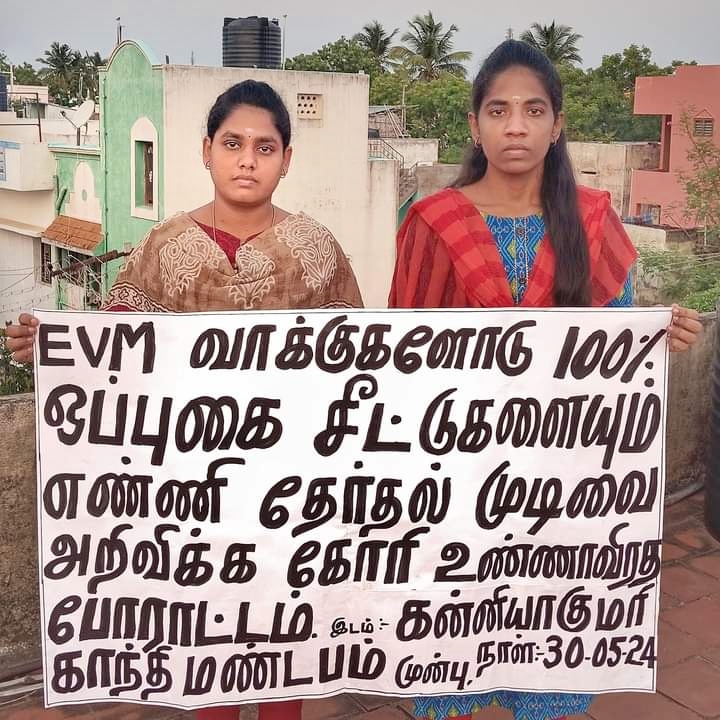 100% ஒப்புகை சீட்டுகளை எண்ணி பாராளுமன்ற தேர்தல் முடிவுகளை அறிவிக்க வேண்டும் என்ற  பாதகை ஏந்தி  கன்னியாகுமரி காந்தி மண்டபம் முன்பு போராட்டம் நடத்தியதற்காக நந்தினி மற்றும் நிரஞ்சனா ஆகியோர் போலீசாரால் கைது செய்யப்பட்டனர்.