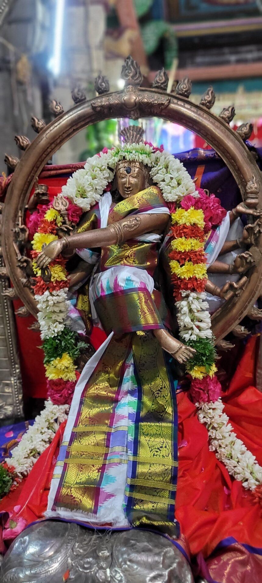 கால் மாறி ஆடிய திருக்கோலத்தில் நடராஜர் அருள்பாலிப்பு மதுரை அருள்மிகு மீனாட்சி அம்மன் சுந்தரேஸ்வரர் திருக்கோவிலில் ஆனி உத்திர திருமஞ்சன திருவிழாவை ஒட்டி பஞ்ச நடராஜ மூர்த்தி புறப்பாடு நடைபெற்றது. இந்த விழாவில் கால் மாறி ஆடிய திருக்கோலத்தில் வெள்ளியம்பல நடராஜர் எழுந்தருளினார். அதே கோலத்தில் நடராஜர் சிவகாமி அம்பாளும் பக்தர்களுக்கு அருள் பாலித்தினர். அப்போது நடைபெற்ற சிறப்பு பூஜையில் சுற்று வட்டாரத்தை சேர்ந்த ஏராளமான பக்தர்கள் பங்கேற்று சுவாமி தரிசனம் செய்தனர்.
