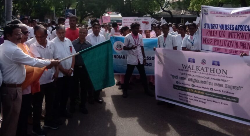 ஈரோட்டில் ஒலி மாசு தடுப்பது குறித்த விழிப்புணர்வு பேரணி ஈரோடு காளிங்கராயன் இல்லத்தில் இருந்து புறப்பட்டது இந்த பேரணி பெருந்துறை ரோடு வழியாக ஈரோடு சம்பத் நகரில் உள்ள இந்திய மருத்துவ சங்கத்தை அடைந்தது இந்திய மருத்துவர் கிளை மற்றும் காது மூக்கு தொண்டை மருத்துவ சங்கம் ஆகியவற்றின் சார்பில் நடந்த இந்த பேரணிக்கு தமிழ்நாடு மருத்துவ சங்கத்தின் தலைவர் டாக்டர் அபுல்ஹசன் தலைமை தாங்கினார் இந்திய மருத்துவ சங்கத்தின் அகில இந்திய தலைவர் அசோகன் கொடி அசைத்து தொடங்கி வைத்தார்