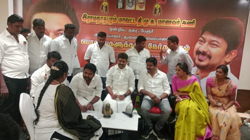எம்எல்ஏ தலைமை வகித்தார். திமுக மாணவரணி தலைவர் ராஜிவ் காந்தி தொடங்கி வைத்தார். அவர் பேசுகையில், தமிழகத்தில் இந்தி எதிர்ப்பு போராட்டத்தில் மாணவர்களின் பங்கு அளப்பரியது. திமுகவில் இளைஞரணியை போல் மாணவரணிக்கு வலுவான கட்டமைப்பு உருவாக்க 30 வயதிற்குட்பட்ட பட்டதாரிகள் திமுக தலைமையின் அறிவுறுத்தல் படி ஒன்றிய, நகர், பேரூர் நிர்வாகிகள் நேர்காணல் மூலம் தேர்வு செய்யப்படுகின்றனர். ராமநாதபுரம் மாவட்ட மாணவரணியில்