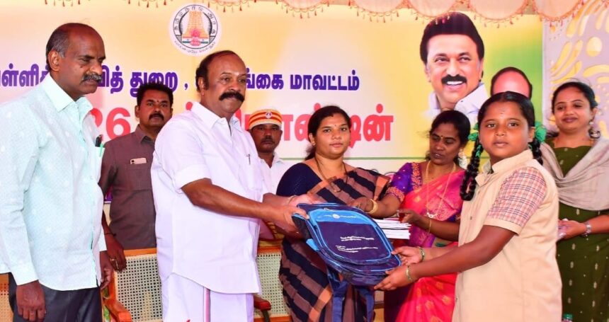 சிவகங்கை மாவட்டத்தில் பள்ளிக் கல்வித்துறையின் சார்பில் 2025-2026ஆம் கல்வியாண்டிற்கான புதிய பாடம் நூல்கள், சீருடைகள், நோட்டு புத்தகங்கள் மற்றும் கற்றலுக்கு தேவையான உபகரணங்களை கூட்டுறவுத்துறை அமைச்சர் கே.ஆர்.பெரியகருப்பன் சிவகங்கை மாவட்டத்தில் மொத்தம் 1,352 பள்ளிகளைச் சார்ந்தவர்கள் மாணாக்கர்களுக்கு விலையில்லா பாடப்புத்தகங்கள், நோட்டுப்புத்தகங்கள் மற்றும் சீருடைகள் வழங்கும் நிகழ்வினை, மாவட்ட ஆட்சியர் ஆஷா அஜித், தலைமையில் சிங்கம்புணரி வட்டத்திற்குட்பட்ட எஸ்.எஸ்.அரசு மேல்நிலைப்பள்ளியில் தொடங்கி வைத்தார். உடன் மாவட்ட கல்வி அலுவலர் (இடைநிலை) சே.மாரிமுத்து, மாவட்ட சமூக நல அலுவலர் ரதிதேவி மற்றும் எஸ்.எஸ்.கோட்டை அரசு மேல்நிலைப்பள்ளி தலைமையாசிரியை லதாராணி மற்றும் ஆசிரியர்கள், மாணவ மாணவிகள் உட்பட பலர் கலந்து கொண்டனர்.