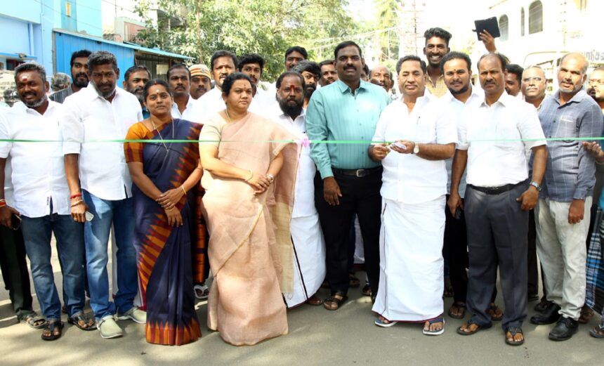 மதுரை மாநகராட்சி மண்டலம் 2 செல்லூர் பகுதியில் (60 அடி சாலை) புதிதாக அமைக்கப்பட்டுள்ள தார் சாலையினை மேயர் இந்திராணி பொன்வசந்த், ஆணையாளர் ச.தினேஷ்குமார், வடக்கு சட்டமன்ற உறுப்பினர் கோ.தளபதி ஆகியோர் பயன்பாட்டிற்கு இன்று திறந்து வைத்தார்கள் அருகில் மண்டலத் தலைவர் சரவணபுவனேஸ்வரி, மாமன்ற உறுப்பினர்கள் குமரவேல், மாயத்தேவன் ஆகியோர் உடன் உள்ளனர்.