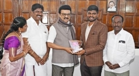 நீலகிரி மாவட்ட திமுக தலைமை செயற்குழு உறுப்பினரும், தனியார் பள்ளியின் தாளாளருமான எக்ஸ்போ. செந்தில் தனது மகன் சிபி ஆதர்ஷ் திருமண அழைப்பிதழை தமிழக முதல்வரிடம் நேரடியாக வழங்கினார. அருகில் திமுகவை சேர்ந்த ஸ்டுடியோ செல்வம் அருகில் உள்ளார்.