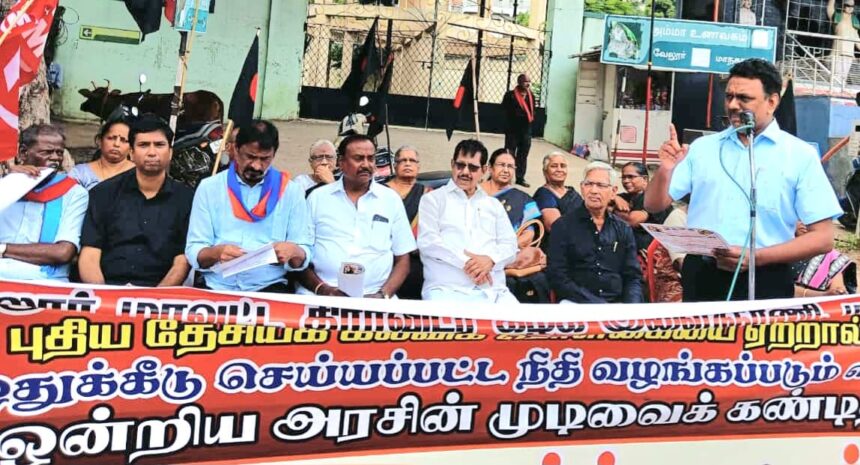 புதிய தேசிய கல்விக் கொள்கையை ஏற்றால்தான் ஒதுக்கீடு செய்யப்பட்ட நிதி வழங்கப்படும் என்கிற ஒன்றிய அரசின் முடிவை கண்டித்து வேலூர் மாவட்ட திராவிடர் கழக இளைஞரணி மற்றும் மாணவரணி சார்பில் கண்டன ஆர்ப்பாட்டம் சத்துவாச்சாரி வேலூர் மாவட்ட ஆட்சியர் அலுவலகம் எதிரில் நடந்தது. இந்த ஆர்ப்பாட்டத்துக்கு திராவிடர் கழக வேலூர் மாவட்ட இளைஞரணி செயலாளர் மற்றும் எழுத்தாளர் இ. தமிழ் தரணி தலைமை வகித்தார். மாவட்ட தலைவர் வி.இ. சிவக்குமார், மாவட்ட செயலாளர் உ. விஸ்வநாதன், பொதுக்குழு உறுப்பினர்கள் கு.இளங்கோவன், க.சிகாமணி, மாவட்ட அமைப்பாளர் நெ.கி. சுப்பிரமணியன், மாவட்ட மகளிர் அணி தலைவர் ந. தேன்மொழி, மாவட்ட காப்பாளர்கள் ந.கலைமணி, ச.ஈஸ்வரி, சத்துவாச்சாரி இரா. கணேசன், மாநகர தலைவர் ந.