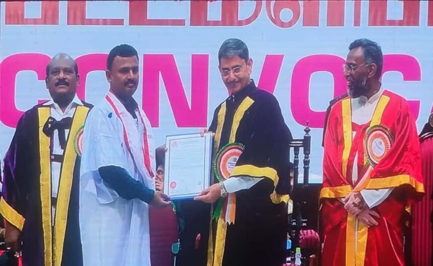 ஈரோடு மாவட்ட தொழிலாளர் துணை ஆணையாளராக இருப்பவர் முருகேசன். இவர் தேயிலை தோட்ட தொழிலாளர்கள் சார்பாக ஆராய்ச்சி செய்து டாக்டர் பட்டம் பெற்று உள்ளார். இதையொட்டி அவருக்கு கோவை பாரதியார் பல் கலைக்கழகத்தில் நடந்த விழாவில் கவர்னர் ரவி பட்டம் மற்றும் சான்றிதழ் வழங்கி பாராட்டினார். 2 வது முறையாக இவருக்கு டாக்டர் பட்டம் வழங்கப்பட்டு உள்ளது குறிப்பிடத்தக்கது.