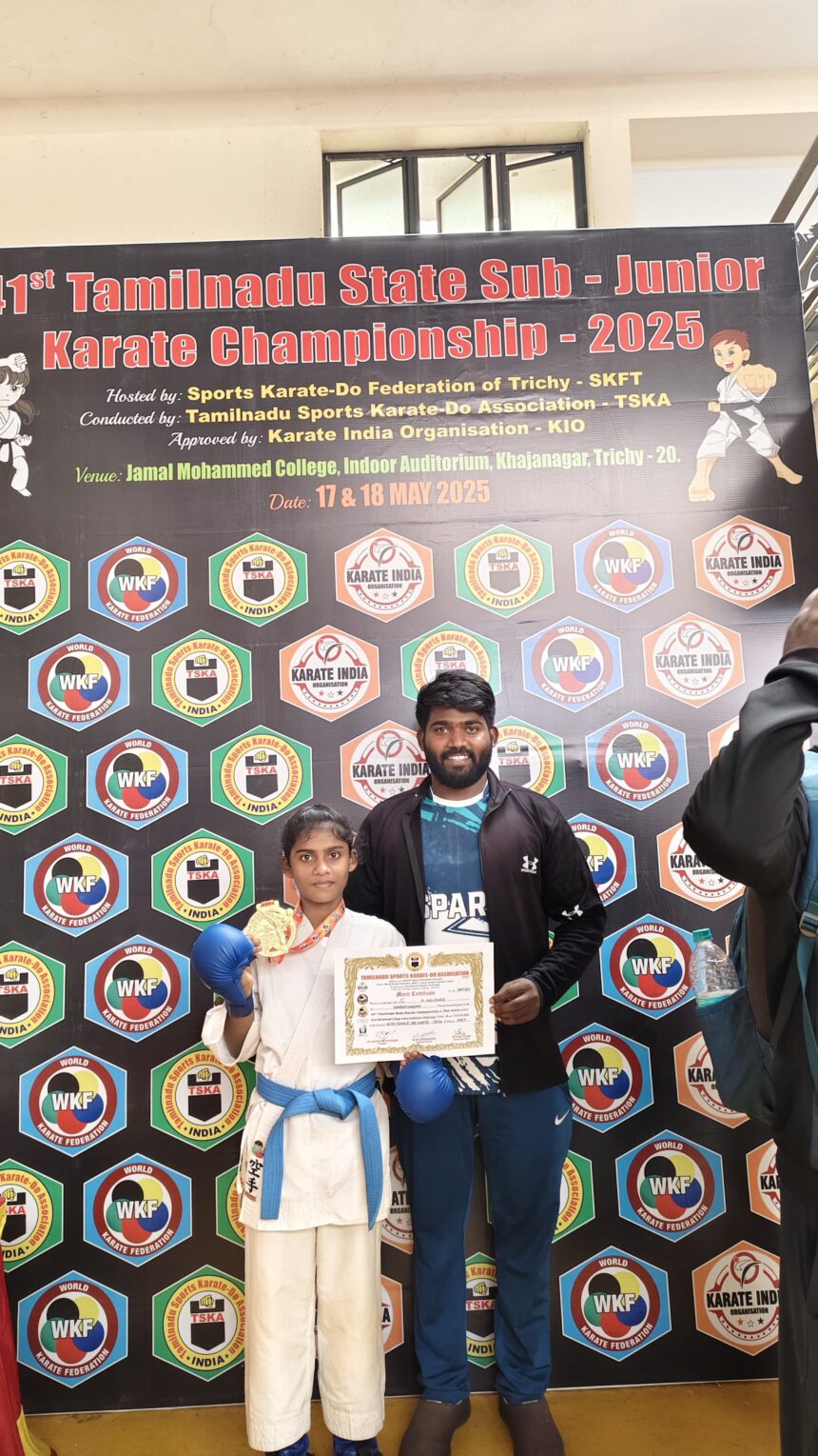 41 வது தமிழ்நாடு மாநில சப் ஜூனியர் கராத்தே சாம்பியன்ஷிப் போட்டி போட்டிகள் திருச்சியில் நேற்று நடைபெற்றது. இதில் 2000 மாணவ மாணவிகள் கலந்து கொண்டனர். இப்போட்டியில் பரமக்குடி ஆயிர வைசிய மெட்ரிக் பள்ளியை சேர்ந்த அனுஶ்ரீ என்ற மாணவி, ராமநாதபுரம் மாவட்டம் சார்பாக மாணவிகளுக்கான 12 வயதுக்குட்பட்ட – 35 கிலோ எடை பிரிவில் கலந்து கொண்டு தங்கம் வென்று சாதனை படைத்துள்ளார்.