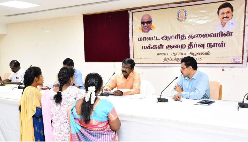 திருப்பத்தூர்:ஜூலை:09, திருப்பத்தூர் மாவட்ட ஆட்சியர் அலுவலக கூட்டரங்கில் நடைப்பெற்ற மக்கள் குறை தீர்வு நாள் கூட்டத்தில் பொதுமக்களிடமிருந்து பல்வேறு கோரிக்கை மனுக்களை மாவட்ட ஆட்சித் தலைவர் தர்ப்பகராஜ் பெற்றுக்கொண்டார். உடன் மாவட்ட வருவாய் அலுவலர் ஜெ.நாராயணன் மற்றும் அனைத்து துறை சார்ந்த அலுவலர்கள் கலந்துக்கொண்டனர்.