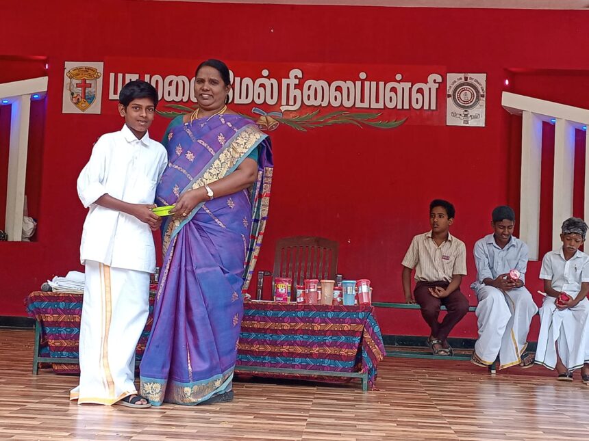 விழா நிறைவில் வெற்றிபெற்ற மாணவர்களுக்கு தலைமையாசிரியை மேரி பாராட்டு செய்து நினைவுப் பரிசுகள் வழங்கினார்.