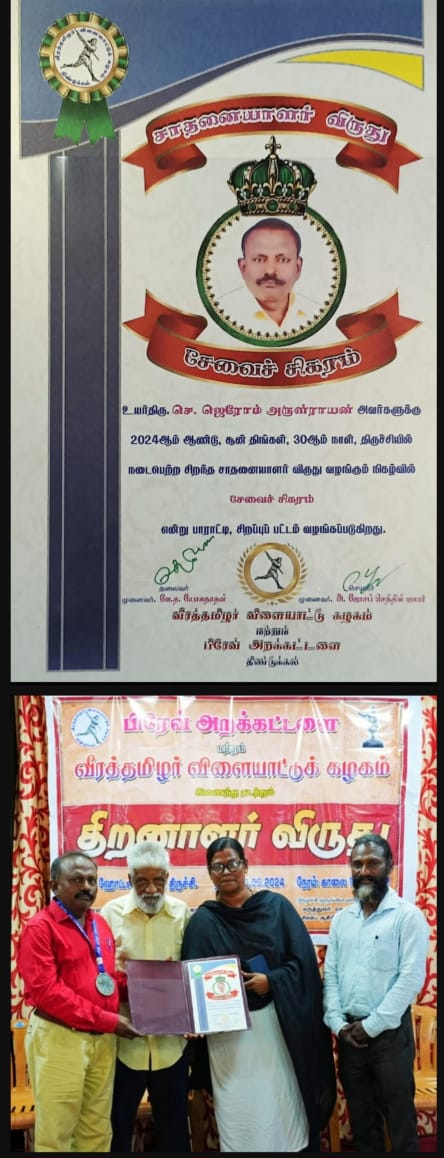 எதிரான விழிப்புணர்வு பணி மற்றும் சமூக சேவையை தொடர்ந்து ஆற்றி வருவதற்கு சேவை சிகரம் விருதினை வீரத்தமிழர் விளையாட்டுக் கழகத்தின் தலைவர் முனைவர்