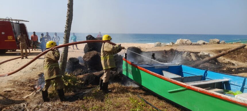 கொல்லங்கோடு அருகே ததேயுபுரம் பகுதியை சேர்ந்தவர் அமலதாசன். மீன்பிடி தொழிலாளி இவருக்கு சொந்தமான ஃபைபர் படகை அந்த பகுதியில் உள்ள கடற்கரையில் நிறுத்தி வைத்திருந்தார். இந்த நிலையில் நேற்று முன்தினம் அந்தப் பகுதியில் உள்ள புல் புதர்கள் திடீரென தீப்பிடித்து எரிந்துள்ளது. அதிலிருந்து பரவிய தீ பைபர் படகிலும் பிடித்துள்ளது.