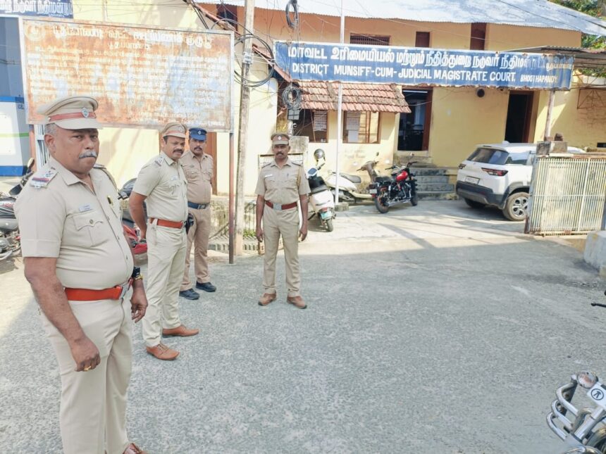நெல்லை மாவட்ட்ததில் நீதிமன்ற வளாகத்தில் நடந்த கொலை சம்பவத்திற்க்கு பிறகு எல்லா நீதிமன்றம் முன்பும் போலீசார் பாதுகாப்பு பணியில் ஈடுபடுத்தபடும் என்று போலீஸ் கமிஷனரின் உத்தரவுபடி பூதப்பாண்டியிலுள்ள நீதிமன்றம் முன்பு காலை 10.00 மணி முதலே பூதப்பாண்டி போலீஸ் இன்ஸ்பெக்டர் முத்துராஜ் தலைமையிலான போலீசார் பாதுகாப்பு பணியில் ஈடுபட்டு வந்தனர்கள்