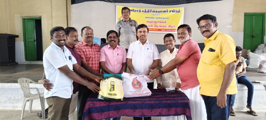 ஈரோடு பத்திரிகையாளர் சங்கம் சார்பில் தைப்பொங்கலை ஒட்டி பொருட்கள் வழங்கும் நிகழ்ச்சி ஈரோடு பெரியார் மன்றத்தில் தலைவர் சண்முகம் தலைமையில் நடந்தது. செயலாளர் ஜீவா தங்க வேல் வரவேற்றார் இதில் 22 தாலுகா நிருபர்கள் உட்பட மொத்தம் 100 பேருக்கு வேட்டி சேலை மற்றும் பொங்கல் பொருட்கள் உள்பட பல்வேறு பொருட்கள் வழங்கப்பட்டன .