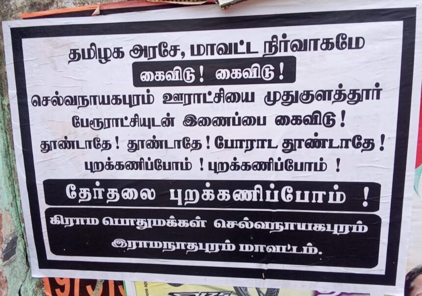 இராமநாதபுரம் மாவட்டம் முதுகுளத்தூர் ஒன்றியத்துக்கு உட்பட்ட செல்வநாயகபுரம் ஊராட்சியை முதுகுளத்தூர் பேரூராட்சியுடன் இணைப்பதற்கு எதிர்ப்பு தெரிவித்து முதுகுளத்தூர் சுற்றுவட்டார பகுதிகளில் போஸ்டர்கள் ஒட்டப்பட்டுள்ளது. முதுகுளத்தூர் அருகே செல்வநாயகபுரம் ஊராட்சியில் செல்வநாயகபுரம் மற்றும் தூரி செயல்பட்டு வந்தது. தற்போது கடந்த சில நாட்களுக்கு முன்பு செல்வநாயகபுரம் ஊராட்சியை முதுகுளத்தூர் பேரூராட்சியுடன் இணைத்து தமிழக அரசு அறிவிப்பாணை வெளியிட்டது. கிராம மக்கள் சில மாதங்களாக செல்வநாயகபுரம் ஊராட்சியை பேரூராட்சியுடன் இணைக்க கூடாது என எதிர்ப்பு தெரிவித்து கிராம மக்கள் சார்பில் இராமநாதபுரம் மாவட்ட ஆட்சியர் உட்பட அரசு அதிகாரிகளுக்கு பலமுறை மனு கொடுத்தனர் அப்போது நடவடிக்கை எடுப்பதாக தெரிவித்ததாக கூறப்படுகிறது. தற்போது கிராம மக்கள் இணைபதை கண்டித்து ஆர்ப்பாட்டம் மற்றும் தேர்தலை புறக்கணிக்க போவதாக கிராம மக்கள் சார்பில் எதிர்ப்பு தெரிவிக்கும் வகையில் கிராம மக்கள் ஒன்றுகூடி தீர்மானம் நிறைவேற்றப்பட்டது முதுகுளத்தூர் மற்றும் அதனை சுற்றியுள்ள இடங்களில் தமிழக