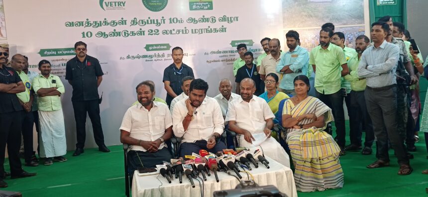 திருப்பூர் வெற்றி அமைப்பின் சார்பில் வனத்துக்குள் திருப்பூர் திட்டம் துவங்கப்பட்டு 10 ஆண்டுகளில் 22 லட்சம் மரக்கன்றுகள் நடப்பட்டது இதனை தொடர்ந்து வனத்துக்குள் திருப்பூர் ஆண்டுவிழா திருப்பூர் மாவட்டம் அவிநாசி அருகே பழங்கரை தனியார் அரங்கில் நடைபெற்றது இதில் கலந்துகொண்ட பாஜக மாநில தலைவர் அண்ணாமலை ஆண்டு விழாவில் வனத்துக்குள் திருப்பூர் அமைப்பினரை வாழ்த்தி பேசினார் பின்னர் 2 லட்சம் மரக்கன்றுகள் நடும் பணிகளை துவக்கி வைத்தார் .