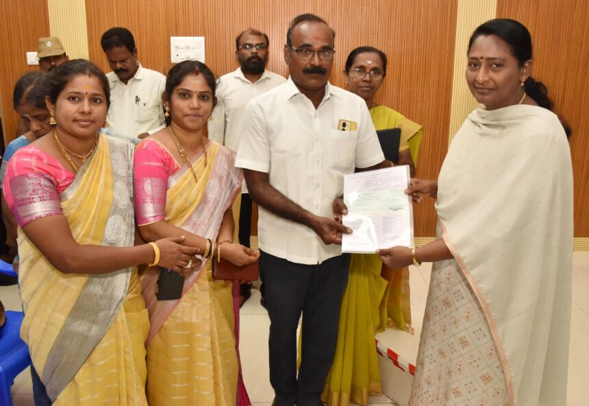 மதுரை மாவட்ட ஆட்சியர் அலுவலக வளாகத்தில் 2023-2024 ஆம் ஆண்டு பெருந்தலைவர் காமராசர் பிறந்த நாளைக் கல்வி வளர்ச்சி நாளக கொண்டாடுவதை முன்னிட்டு மதுரை மாவட்டத்தில் தேர்ந்தெடுக்கப்பட்ட பள்ளிகளுக்கு பரிசுத்தொகைக்கான காசோலைகளை மாவட்ட ஆட்சித்தலைவர் மா.சௌ.சங்கீதா வழங்கினார். மதுரை மாவட்ட முதன்மை கல்வி அலுவலர் (பொ) பெ.இந்திரா உடன் உள்ளார்.