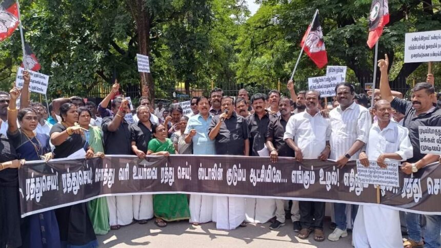 திமுக அரசு தமிழகத்தில் பொறுப்பேற்ற பின்பு பல்வேறு பொருட்களின் விலைவாசி உயர்ந்துள்ளது,குறிப்பாக வீட்டுவரி உயர்வு, சொத்துவரி உயர்வு, மின்கட்டன உயர்வு, அனைத்து அத்தியாவசிய பொருட்களின் விலைவாசி உயர்வு மற்றும் இளைஞர்களின் எதிர்காலத்தை சீர்குலைக்கும் போதை பொருட்கள் புழக்கத்தை கட்டுபடுத்த தவறியதை உள்ளிட்டவற்றை கண்டித்து அதிமுக சார்பில் தமிழகமெங்கும் மனித சங்கிலி போராட்டம் அறிவிக்கப்பட்டது. அந்த வகையில் கன்னியாகுமரி மாவட்டத்தில் 21 இடங்களில் அதிமுக சார்பில் போராட்டங்கள் நடைபெற்றது இதில் நாகர்கோவில் வேப்பமூடு சந்திப்பில் இருந்து அண்ணா பேருந்து நிலையம் வரை எம் எல் ஏ. தளவாய்சுந்தரம் தலைமையில் மனித போராட்டம் நடைபெற்றது. இதில் அதிமுகவினர் 200க்கும் மேற்பட்டோர் கலந்து கொண்டனர் மேலும் தமிழக அரசை கண்டித்து கோஷங்களை எழுப்பினர்.