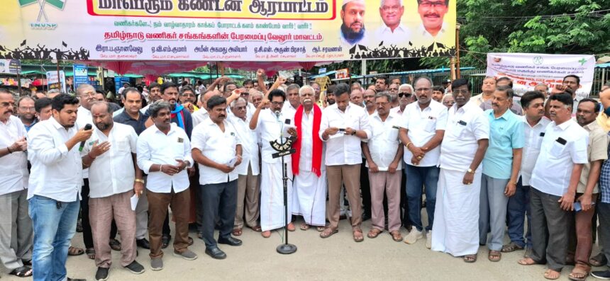 வேலூர் மாவட்டம், வேலூர் அண்ணா கலையரங்கம் அருகில் தமிழ்நாடு வணிகர் சங்கங்களின் பேரமைப்பு சார்பில் மத்திய மாநில அரசுகளின் வணிக விரோத சட்டங்களை முழுமையாக திரும்ப பெற கோரி வேலூர் மாவட்ட தலைவர் இரா.ப. ஞானவேலு தலைமையில் கண்டன ஆர்ப்பாட்டம் நடைபெற்றது. உடன் வேலூர் மாவட்ட செயலாளர் ஏவிஎம் குமார் ,வேலூர் மாவட்ட பொருளாளர் அமீன் அகமது அலியார், வே.மா.இ.அணி செயலாளர் ஏ.சி.என். அருண்பிரசாத் ,வேலூர் மாவட்ட செய்தி தொடர்பாளர் ஆர் .சரவணன், உள்ளிட்டோர் பலர் கலந்து கொண்டனர்.