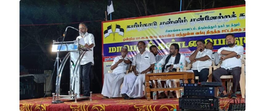 தமிழ்நாடு முஸ்லிம் முன்னேற்றக் கழகம் சிவகங்கை மாவட்டம் திருப்புத்தூரில் ஒன்றிய அரசு கொண்டு வந்த வக்பு திருத்த சட்டம் வாபஸ் பெறக்கோரி மாபெரும் கண்டன பொதுக்கூட்டம் நடைபெற்றது.