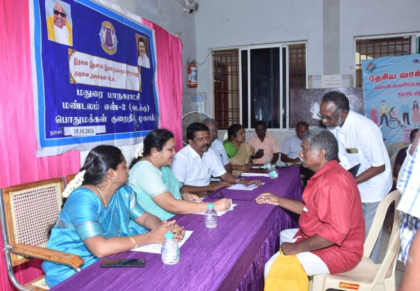 மதுரை மாநகராட்சி மண்டலம் 2 (வடக்கு) அலுவலகத்தில் பொதுமக்கள் குறைதீர்க்கும் முகாம் மேயர் இந்திராணி பொன்வசந்த் தலைமையில் நடைபெற்றது. மதுரை மாநகராட்சி மண்டலம் 2 (வடக்கு) அலுவலகத்தில் நடைபெற்ற பொது மக்கள் குறைதீர்க்கும் முகாமில் சொத்து வரி பெயர் மாற்றம், புதிய சொத்து வரி மற்றும் வரி திருத்தம் காலிமனை வரி விதிப்பு வேண்டி 11 மனுக்களும், சாலை வசதி, பாதாள சாக்கடை மற்றும் குடிநீர் உள்ளிட்ட வசதிகள் வேண்டி 8 மனுக்களும், சுகாதாரம் தொடர்பாக 1 மனுவும், இதர கோரிக்கைகைள் வேண்டி 2 மனுக்களும் என மொத்தம் 22 மனுக்கள் பொது மக்களிடம் இருந்து மேயர் நேரடியாக பெறப்பட்டது.