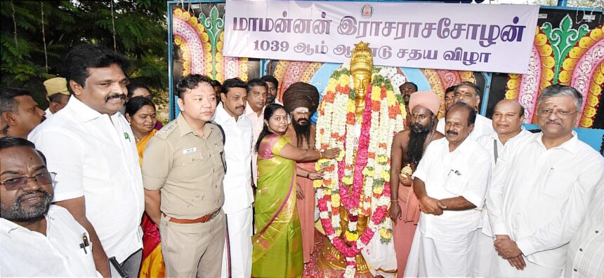 தஞ்சாவூரில் மாமன்னன் ராஜராஜ சோழனின் 1039 ஆம் ஆண்டுசதய விழாவினை முன்னிட்டு அவரது திருவுருவ சிலைக்கு தஞ்சாவூர் மாவட்ட ஆட்சித் தலைவர் பிரியங்கா பங்கஜம் மாலை அணிவித்துமரியாதை செலுத்தினர் .