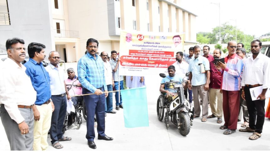 திருப்பத்தூர் மாவட்ட ஆட்சியர் அலுவலக வளாகத்தில் தமிழ்நாடு மாற்று திறனாளிகள் நலத்துறை திருப்பத்தூர் மாவட்டம் சார்பில் சர்வதேச காது கேளாதோர் தின மற்றும் இந்திய செய்கை மொழி தினத்தை முன்னிட்டு மாவட்ட மாற்றுத்திறனாளிகள் நலத்துறை அலுவலர் கண்ணன் தலைமையில் பேரணி நடைபெற்றது