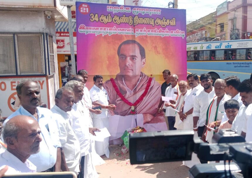 முன்னாள் பிரதமர் ராஜிவ்காந்தியின் 34 வது நினைவு தினத்தையொட்டி ராமநாதபுரம் நகர், மாவட்ட காங்கிரஸ் கமிட்டி சார்பில் மாவட்ட பொறுப்புக்குழு உறுப்பினர் ராஜாராம் பாண்டியன் தலைமையில் அவரது ஏற்பாட்டில் நடந்த நினைவு ஏஞ்சல் நிகழ்ச்சியில் முன்னாள் பிரதமர் ராஜீவ் காந்தி திருஉருவ படத்திற்கு மலர் தூவி அஞ்சலி செலுத்தினர். பின்னர் மாவட்ட பொறுப்பு குழு உறுப்பினர் ராஜாராம் பாண்டியன் “கொடுஞ்செயல் குறித்து உறுதிமொழி வாசிக்க கட்சியினர் உறுதிமொழி ஏற்றனர்.