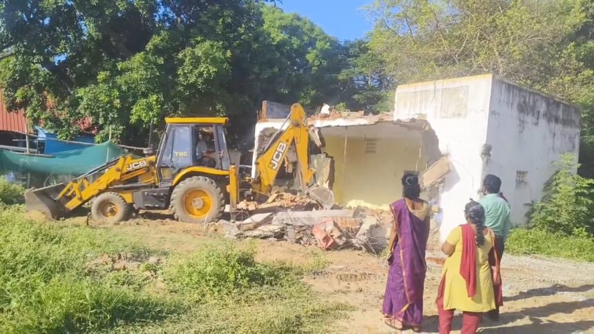 வட்டாட்சியர் வாசுதேவன், தலைமையில் நகராட்சி அதிகாரிகள் ஜேசிபி இயந்திரத்தின் மூலமாக கட்டிடங்களை இடிக்கப்பட்டு இடத்தை மீட்கப்பட்டனர்.