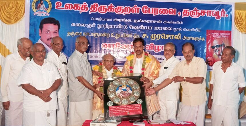 தஞ்சாவூர் பெசன்ட் அரங்கில் உலக திருக்குறள் பேரவை சார்பில் பொறியாளர் அரங்க தங்கராசன் எழுதிய கலைஞர் நூற்றாண்டு வெண்பா மாலை நூல் வெளியீட்டு விழா, மக்களவை உறுப்பினர் ச.முரசொலிக்குவரவேற்பு விழா சிறப்பாக நடைபெற்றது.