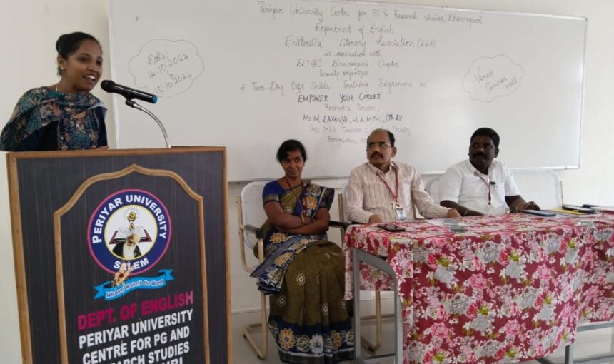 தருமபுரி அடுத்த பைசுஹள்ளியில் செயல்பட்டு வரும் பெரியார் பல்கலைக்கழக பட்ட மேற்படிப்பு மற்றும் ஆராய்ச்சி மைய ஆங்கிலத் துறையின் என்லிட்டரசியா இலக்கிய மன்றத்தின் சார்பாகவும் எல்டாய் தருமபுரி அமைப்பு சார்பாகவும் இரண்டு நாள் மென்திறன் மேம்பாட்டு பயிலரங்கம் ‘வேலை வாய்ப்பினை மேம்படுத்திக் கொள்ளுங்கள்’ என்ற தலைப்பில் நடைபெற்றது. இதில் பெங்களூருவைச் சார்ந்த மென்திறன் மேம்பாடு பயிற்றுனர் திருமதி. லாவண்யா சிறப்பு விருந்தினராக கலந்து கொண்டு பல்வேறு வாழ்வியல் திறன்களான கருத்து பரிமாற்றம், பொது இடத்தில் பேசுதல், மன அழுத்தம் மற்றும் கவலையை கட்டுப்படுத்தும் செயல்முறைகள், மிக முக்கியமாக நேர மேலாண்மை மற்றும் நேர்காணலில் செயல்பட வேண்டிய விதம் குறித்தும் தெளிவாக எடுத்துரைத்தார். இன்றைய கால சூழலில் இளம் தலைமுறையினர் எவ்வாறு நேர மேலாண்மையில் தவறு செய்கின்றனர், சமூக ஊடகங்களில் நேர விரையம் செய்கின்றனர் என்பதை பற்றியும் அதே சமயத்தில் அச்சமுகஊடகங்களின் வாயிலாக சரியான வகையில் நேரத்தை பயன்படுத்தி அதில் இருக்கக்கூடிய வாழ்வியல் மேம்பாட்டிற்கான தகவல்களை எவ்வாறு பயன்படுத்திக் கொள்ளலாம் என்பதை பற்றியும் வெகு சிறப்பாக எடுத்துரைத்தார். மேலும் பொது இடத்தில் பேசுதல் மன அழுத்தம் மற்றும் கவலைகளை போக்குவது குறித்து பல்வேறு விளையாட்டுகள் மூலமாக மாணவ,மாணவிகளுக்கு எளிதில் புரியும் வண்ணம் எடுத்துரைத்தார். முன்னதாக ஆராய்ச்சி மைய இயக்குனர் (பொ) முனைவர் மோகனசுந்தரம் தலைமை தாங்கினார். ஆங்கிலத்துறை தலைவர் பேரா. முனைவர் கோவிந்தராஜ் திருக்குறளில் கூறப்பட்டுள்ள வாழ்வியல் திறன் மேம்பாடுகளை எடுத்துக் கூறி இந்நிகழ்வுக்கான துவக்க உரையாற்றினார். மேலும் இப்பயிலரங்க அமைப்பாளரும் ஆங்கிலத்துறை உதவி பேராசிரியருமான முனைவர் கிருத்திகா நிகழ்வுக்கு வந்திருந்த அனைவரையும் வரவேற்று சிறப்பு விருந்தினரை அறிமுகம் செய்து வைத்தார். தொடர்ந்து இப்பயிலரங்கில் பங்கேற்ற அனைத்து மாணவ, மாணவிகளுக்கு
