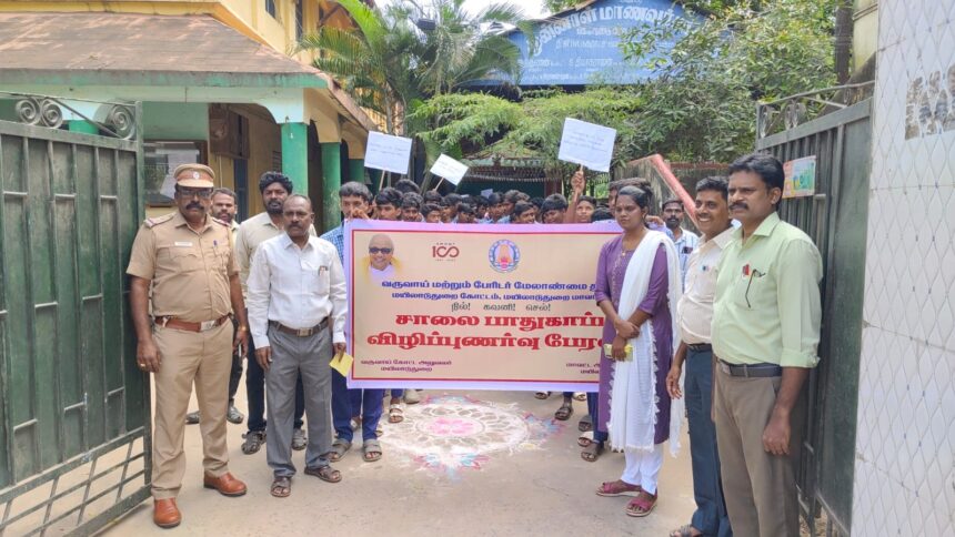 ஆண்டுதோறும் ஜன.1 முதல் ஜன.31 வரை தேசிய சாலை பாதுகாப்பு மாதம் கடைப்பிடிக்கப்படுகிறது. அவ்வகையில் நடைபெற்று வரும் 36-வது தேசிய சாலை பாதுகாப்பு மாத நிகழ்ச்சியாக, மயிலாடுதுறையில் வாகன ஓட்டிகள், மாணவர்கள் மற்றும் பொதுமக்களுக்கு விழிப்புணர்வு ஏற்படுத்தும் விதமாக சாலை பாதுகாப்பு விழிப்புணர்வு பேரணி நடத்தப்பட்டது. தியாகி நாராயணசாமி நகராட்சி மேல்நிலைப்பள்ளியில் நடைபெற்ற நிகழ்ச்சியில் வருவாய் கோட்டாட்சியர் ஆர்.விஷ்ணுபிரியா கலந்துகொண்டு பள்ளி மாணவர்களுக்கு விழிப்புணர்வு ஏற்படுத்தி பேசினார். தொடர்ந்து, அனைவரும் சாலை பாதுகாப்பு உறுதிமொழி ஏற்றுக்கொண்டனர். பின்னர் நடைபெற்ற பேரணியை கோட்டாட்சியர் தொடக்கி வைத்தார். இதில், இப்பள்ளியின் மாணவர்கள் நூற்றுக்கும் மேற்பட்டோர், விழிப்புணர்வு பதாகைகளை ஏந்தி, முழக்கங்களை எழுப்பியவாறு, புதிய பேருந்து நிலையம், பழைய பேருந்து நிலையம், மணிக்கூண்டு வழியாக சென்று மீண்டும் பள்ளியை அடைந்தனர்.