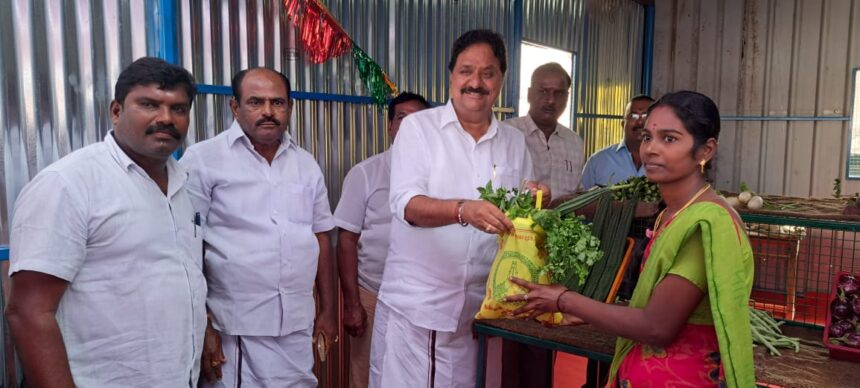 கிருஷ்ணகிரி மாவட்டம் போச்சம்பள்ளி பேருந்து நிலையம் அருகே கிருஷ்ணகிரி வட்ட வேளாண்மை உற்பத்தியாளர்கள் மற்றும் கூட்டுறவு விற்பனைச் சங்கம் சார்பில் முதல்வரின் மக்களை தேடி துரித சேவை திட்டம் காய்கறி விற்பனை அங்காடி கிருஷ்ணகிரி கிழக்கு மாவட்ட செயலாளரும் பர்கூர் சட்டமன்ற உறுப்பினருமான