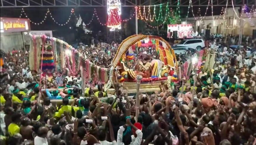 அப்போது, பொதுமக்கள் அவருக்கு தீபாராதனை காட்டி வழி பாடு மேற்கொண்டனர். அதிகாலை மீண்டும் ஆதீனத்திருமடத்தை அடைந்த குருமகா சந்நிதானம் ஞானக்கொலுக்காட் சியில் அமர்ந்து பக்தர்களுக்கு அருளாசி வழங்கினார்.