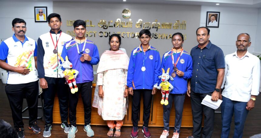 கிருஷ்ணகிரி மாவட்ட ஆட்சியர் அலுவலக கூட்டரங்கில், மாநில அளவிலான முதலமைச்சர்க் கோப்பை விளையாட்டு போட்டிகள் மற்றும் தேசிய அளவிலான குத்துச்சண்டைப் போட்டிகளில் வெற்றிப்பெற்று பதக்கங்களை வென்ற கிருஷ்ணகிரி மாவட்டத்தை சேர்ந்த பள்ளி மற்றும் கல்லூரி மாணவ, மாணவியர்கள் மாவட்ட ஆட்சித்தலைவர் .கே.எம்.சரயு ., அவர்களிடம் பதக்கங்களை காண்பித்து வாழ்த்து பெற்றனர்.