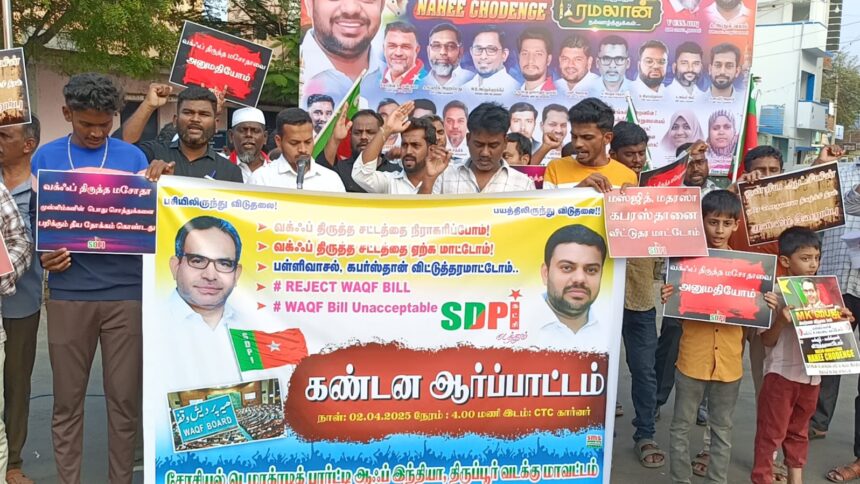 எஸ்டிபிஐ கட்சி திருப்பூர் வடக்கு மாவட்ட சார்பாக வஃக்ப் திருத்த சட்டத்தை ஏற்க மறுத்து திருப்பூர் சி டி சி கார்னர் அருகே மாவட்ட பொதுச் செயலாளர் அப்துல் வஹாப் தலைமையில் 50க்கும் மேற்பட்டோர் ஆர்ப்பாட்டத்தில் ஈடுபட்டனர்.