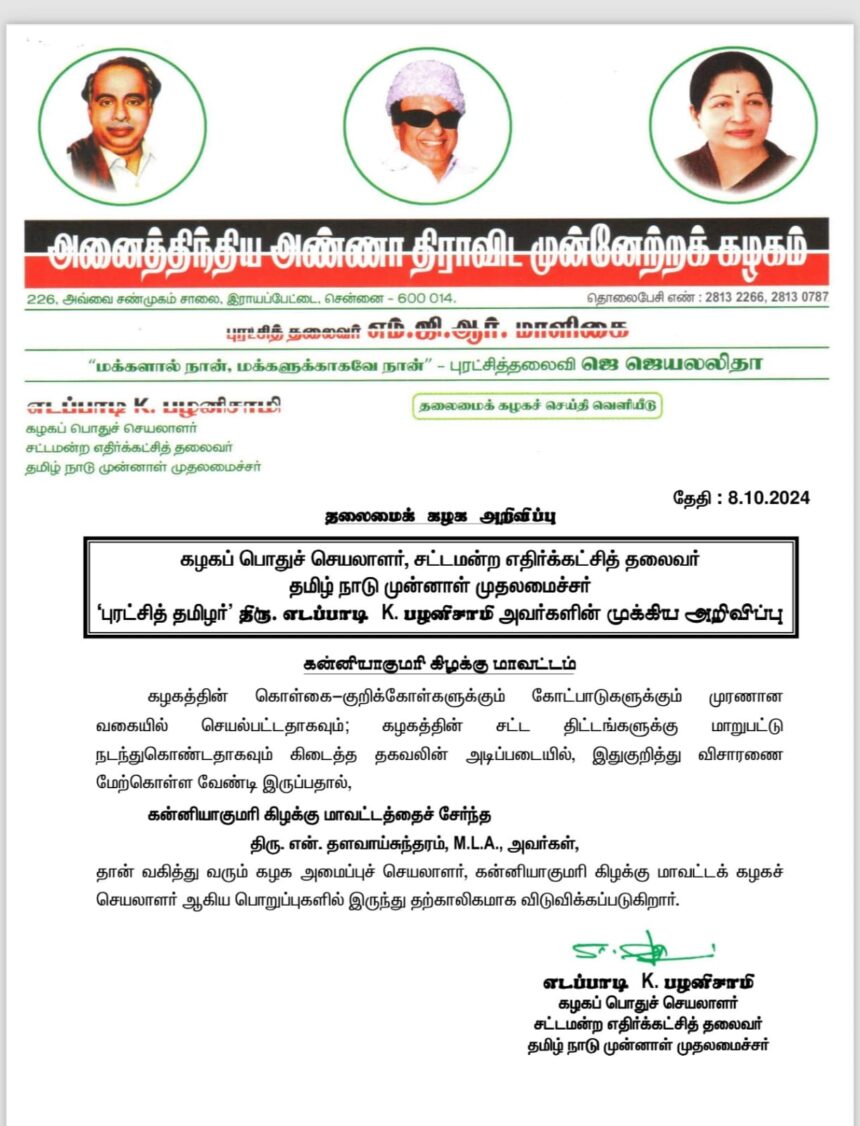 கன்னியாகுமரி சட்டமன்ற உறுப்பினராகவும், அதிமுக அமைப்புச் செயலாளராகவும், குமரி கிழக்கு மாவட்டச் செயலாளராகவும், இருப்பவர் தளவாய் சுந்தரம்.கன்னியாகுமரி கிழக்கு மாவட்டத்தில் அதிமுகவை ஆக்டிவாக வைத்திருந்தாலும் அடிக்கடி சர்ச்சையில் சிக்கி வந்தார்.
