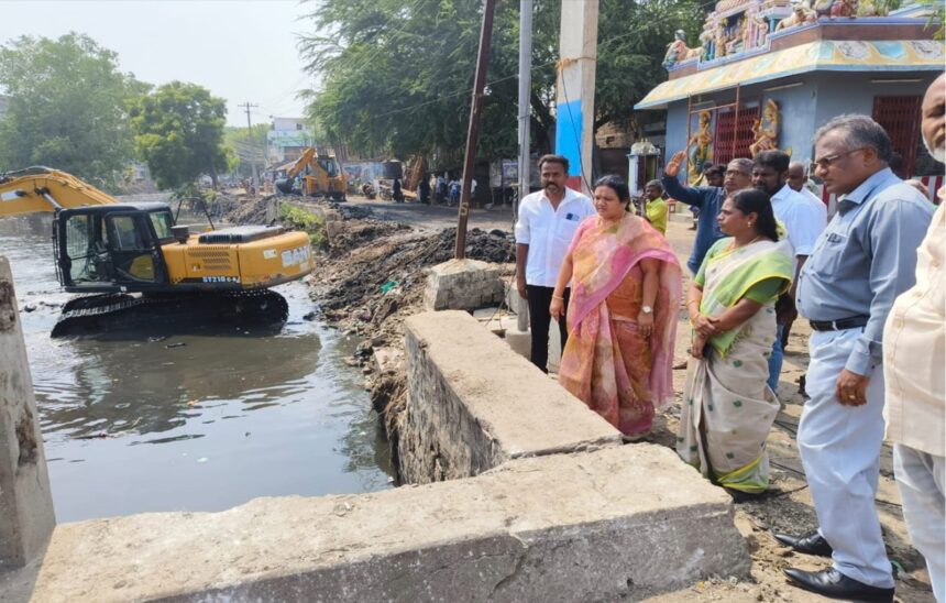 மதுரை மாநகராட்சி பந்தல்குடி வாய்க்கால் தூர்வாரும் பணிகளை மேயர் இந்திராணி பொன்வசந்த் நேரில் பார்வையிட்டு ஆய்வு மேற்கொண்டார். மதுரை மாநகராட்சிக்கு உட்பட்ட பகுதிகளில் உள்ள வாய்க்கால்கள், நீர்நிலைகள், கால்வாய்கள், ஊரணிகள், மழைநீர் வடிகால்கள் ஆகியவற்றில் தேங்கியுள்ள ஆகாயத்தாமரைகள், தேவையற்ற குப்பைகள், மண்துகள்கள், வளர்ந்துள்ள செடி கொடிகள் உள்ளிட்டவற்றை அகற்றி தூர்வாரும் பணிகள் மேற்கொண்டு மழைநீர் சீராக செல்வதற்கு உரிய நடவடிக்கைகள் மாநகராட்சியின் சார்பில் தொடர்ந்து மேற்கொள்ளப் பட்டு வருகிறது. மதுரை மாநகராட்சி செல்லூர் பந்தல்குடி வாய்க்காலில் மழைநீர் சீராக செல்வதற்கு தேங்கியுள்ள மண் படிவங்கள், பிளாஸ்டிக் குப்பைகள் உள்ளிட்டவற்றை அகற்றி தூர்வாரும் பணிகள் மேற்கொள்ளப்பட்டு வருவதை மேயர் நேரில் பார்வையிட்டு ஆய்வு மேற்கொண்டார். தொடர்ந்து குலமங்கலம் மெயின் சாலை பகுதியில் பாதாள சாக்கடை பராமரிப்பு பணிகள் மற்றும் செல்லூர் 60 அடி சாலை பகுதியில் குடிநீர் குழாய் பராமரிப்பு பணிகள் மேற்கொள்வதை நேரில் பார்வையிட்டு ஆய்வு மேற்கொண்டார். செல்லூர் பந்தல்குடி வாய்க்கால் தூர்வாரும் பணியில் 9 ஹிட்டாட்சி வாகனங்கள், 2 ஜே.சி.யி.இயந்திரங்கள், 2 ரோபோ, 3 டிராஸ் லாரிகள், 3 டிப்பர் லாரிகள், 10 டிராக்டர்கள் உள்ளிட்ட பல்வேறு வாகனங்கள் மூலம் தூர்வாரும் பணிகள் மேற்கொள்ளப்பட்டு