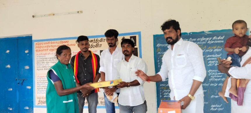 திருவாடானை அருகில் அஞ்சுகோட்டை கிராமத்தில் தமிழக வெற்றி கழகம் சார்பில் வீர மங்கை வேலுநாச்சியார் பிறந்தநாளை முன்னிட்டு துப்புரவு தொழிலாளர் களுக்கு இலவச வேஷ்டி சேலை வழங்கினர். தொடர்ந்து அருகில் உள்ள பள்ளி குழந்தைகளுக்கு இனிப்பு வழங்கினர். தமிழக வெற்றி கழகம் நிர்வாகி