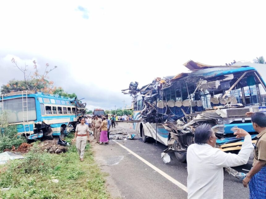 தென்காசி மாவட்டம் கடையநல்லூர் அருகே தென்காசியில் இருந்து ஸ்ரீவில்லிபுத்தூர் சென்ற தனியார் பேருந்தும், கோவில்பட்டியில் இருந்து தென்காசி நோக்கி சென்று கொண்டிருந்த மற்றொரு தனியார் பேருந்தும் இடைகால் அருகே உள்ள துரைச்சாமிபுரம் என்ற இடத்தில் நேருக்கு நேர் மோதி விபத்துக்குள்ளானது. இந்த விபத்தில் சம்பவ இடத்திலேயே ஆறு பேர் உயிரிழந்தனர்.