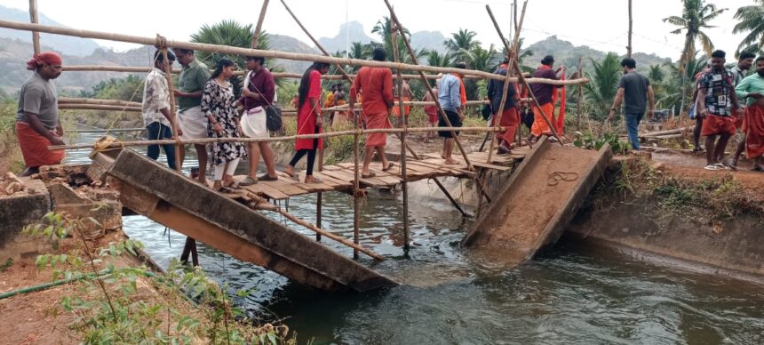 இந்த நிலையில் நேற்று மதியம் சுமார் 1:30 மணியளவில் பழைய பாலம் இரண்டாக உடைந்து கால்வாயில் விழுந்தது. இதில் பாலத்தில் நடந்து சென்ற பக்தர்கள் மூன்று பேர் படுகாயம் அடைந்தனர். அவர்களை சக பக்தர்கள் மீட்டு மருத்துவமனைக்கு அனுப்பி வைத்தனர். இது குறித்து அப்பகுதி மக்கள் பழைய பாலங்களை அகற்றிவிட்டு புதிய பாலங்கள் கட்ட சம்பந்தப்பட்ட துறையினர் நடவடிக்கை எடுக்க வேண்டும் என கோரிக்கை வைத்தனர்.