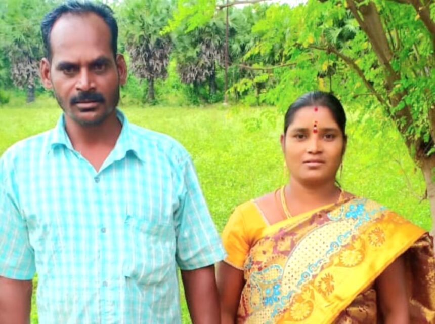 ஆனந்திக்கு திருமணம் ஆகி காட்பாடி அருகே உள்ள வள்ளிமலை கோட்டை நத்தம் பகுதியில் வசித்து வருகிறார். திரிஷா சற்று வாய் பேச முடியாதவர்.  இதற்கிடையில் ராமுவுக்கும், ராதாவுக்கும் அடிக்கடி தகராறு ஏற்படுவது வழக்கம்.  இதனால் ராமு ஆத்திரத்தில் ராதாவை அவ்வப்போது கடுமையாக தாக்குவதை வழக்கமாக கொண்டிருந்தார். அத்துடன் மனைவி ராதாவின் நடத்தையில் சந்தேகப்பட்டு ராமு குடிபோதையில் வந்து ரகளை செய்வதை வழக்கமாக கொண்டிருந்தார். தந்தை ராமுவின் போக்கு பிடிக்காத மகன் ஆனந்த் தனது தாய் ராதாவை காட்பாடி அருகே உள்ள  கோட்டநத்தம் பகுதியில் உள்ள  அவரது பாட்டி வீட்டிற்கு அனுப்பி அங்கேயே இருக்கும்படி கூறியுள்ளார். இந்நிலையில் தனது தாய் வீட்டில் தங்கி அங்கிருந்தபடியே ராதா பல்வேறு இடங்களில் விவசாய கூலி வேலைகளைச் செய்து வந்தார். இந்நிலையில் ராமுவும்,  ராதாவும் கடந்த இரண்டு நாட்களுக்கு முன்பாக காட்பாடி அருகே பள்ளிக்குப்பம் பகுதியில் சேட்டு மற்றும் ராதிகாவுக்குச் சொந்தமான நிலத்தில் வேலை செய்துவிட்டு புதியதாக  கட்டப்பட்டுள்ள சேட்டு -ராதிகாவின் வீட்டுக்கு வெளியே தங்கிக் கொள்வதை வழக்கமாக கொண்டிருந்தனர்.
