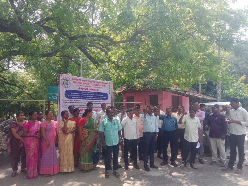 தருமபுரி மாவட்ட ஆட்சியர் அலுவலகம் அருகில் திருநெல்வேலி மாவட்ட ஆட்சியரை கண்டித்து தமிழ்நாடு வருவாய் அலுவலர் சங்கம் சார்பில் நடைபெற்ற கண்டன ஆர்ப்பாட்டத்திற்கு பாலசுப்பிரமணியம் மாவட்ட செயலாளர் தலைமை தாங்கினார். இந்நிகழ்வில் திருநெல்வேலி மாவட்ட ஆட்சித் தலைவர் ஊழியர் விரோத, எதேச்சதிகார நடவடிக்கைகளை கண்டித்து மாநிலத்தின் அனைத்து வருவாய் துறை அலுவலகம் முன்பாக கண்டனப்பதாகைகள் வைப்பது, திருநெல்வேலி மாவட்ட ஆட்சித் தலைவர் ஆய்வுக் கூட்டங்களில் அனைத்து நிலை அலுவலர்களை தரக்குறைவாக பேசுவதை ஒருமையில் வசைப்பாடுவதையும் பின் அலுவலர்களை கண்ணியக் குறைவாக குறிப்பிடுவதையும் முற்றிலும் கைவிட வேண்டும், வருவாய்த்துறை அலுவலர் மீது ஏற்படுத்தப்பட்டுள்ள பாரபட்சமான பழிவாங்க நடவடிக்கைகளை உடனே ரத்து செய்து தர வேண்டும், வருவாய்த்துறை அலுவலர்கள் அச்சுறுத்தல் இன்றி சுமூகமாக மக்கள் பணி மேற்கொள்ள வழிவகை செய்ய வேண்டும் உள்ளிட்ட கோரிக்கைகளை வலியுறுத்தி தமிழ்நாடு வருவாய்துறை அலுவலர் சங்கம் சார்பில் கண்டன ஆர்ப்பாட்டம் நடைபெற்றது. இந்நிகழ்ச்சியில் அசோக்குமார், ராஜீவ் காந்தி மாவட்டத் துணைத் தலைவர் மற்றும் வருவாய்த்துறை அலுவலர்கள் கலந்து கொண்டனர்.
