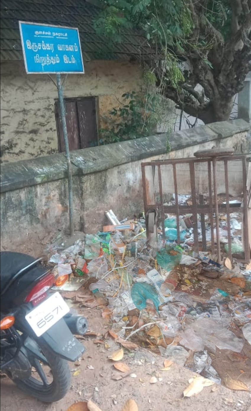 கன்னியாகுமரி மாவட்டம் குளச்சல் நகராட்சிக்குட்பட்ட அண்ணாசிலை அருகில் இருசக்கர வாகனங்கள் நிறுத்தும் இடத்தில் குப்பைகளை ஆங்காங்கே கொட்டப்படுவதால் சுகாதாரகேடு ஏற்படுவதுடன், நோய் தொற்று பரவும் அபாயம் ஏற்பட்டுள்ளது. அது மட்டுமல்லாமல் அதிக அளவில் குப்பைகள் கிடைப்பதால், வாகனங்களை நிறுத்தவும், அப்பகுதியை கடந்து செல்லவும் முடியாதபடி துர்நாற்றம் வீசுகிறது. சுத்தம், சுகாதாரம் மற்றும் மாசற்ற காற்று போன்றவற்றை பாதுகாக்க வேண்டிய நகராட்சி பொதுமக்களின் தேவை அறிந்து செயல்படாமல் வரி வசூல் செய்வதில் மட்டுமே முழு கவனம் செலுத்துவதால் பொதுமக்களின் நலனில் கவனம் செலுத்தாமல் இருந்து வருவதாக பொதுமக்கள் குற்றச்சாட்டு.