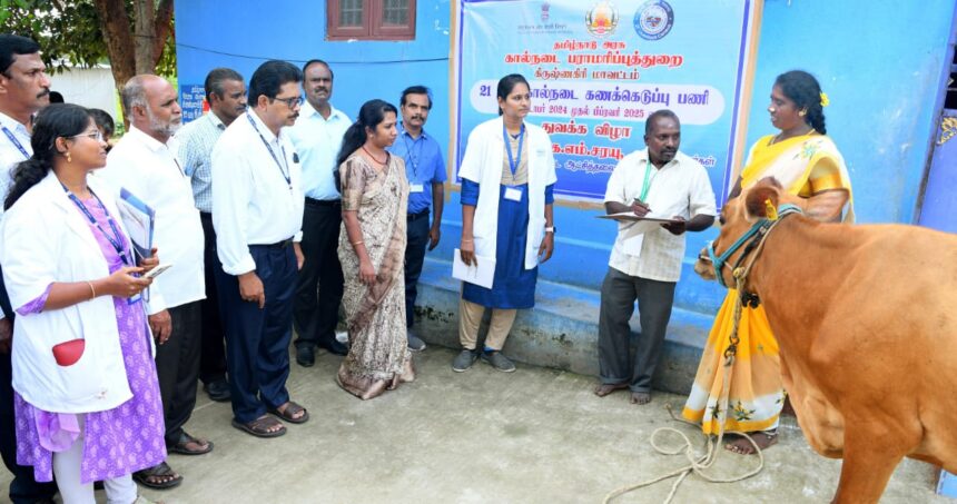 அவர்கள் தெரிவித்தார்.இந்நிகழ்ச்சியில் கால்நடை பராமரிப்புத்துறை மண்டல இணை இயக்குநர்.மரு .சி.இளங்கோவன், மாவட்ட கணக்கெடுப்பு ஒருங்கிணைப்பாளர் துணை இயக்குநர் மரு.ஜோ.பிரசன்னா, உதவி இயக்குநர்கள் மரு.அ.அருள்ராஜ், மரு.ஜ.மகேந்திரன் மரு.ஜோதிபாசு, கால்நடை உதவி மருத்துவர்கள் மரு.ஆ.தினேஷ், மரு.சி.சிவசங்கரி, மரு.வேலன், மரு.சுவாமிநாதன், மரு.ராஜி, மரு.கு.ஸ்ரீவித்யா, மரு.ரகுபதி, மரு.சரண்ராஜ், மரு.ராஜராஜன், மரு.வெங்கடசுப்ரமணியன், மரு.ராஜேஷ் மற்றும் ஊராட்சி மன்ற தலைவர் .அமிர்ஜான், துறை சார்ந்த அலுவலர்கள், கால்நடை வளர்ப்போர் ஆகியோர் கலந்து கொண்டனர்.