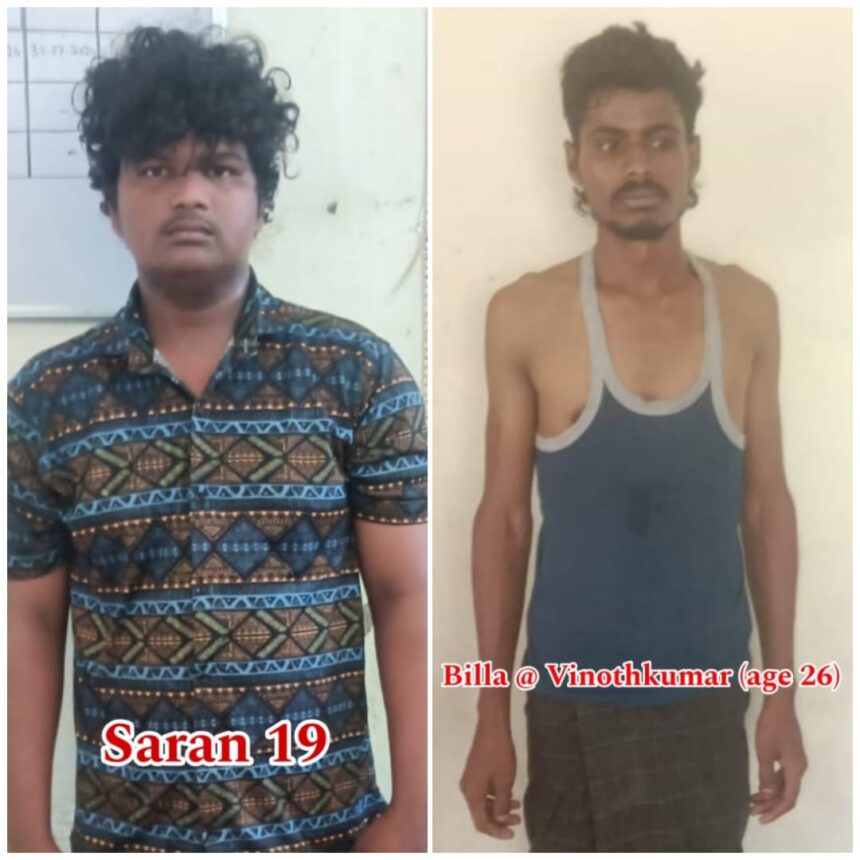 அரியலூர் மாவட்டம், செந்துறை வட்டம் நாகல்குழி நடுத்தெருவைச் சேர்ந்த கொளஞ்சியப்பன் மகன் வினோத் (எ) பில்லா (25/24) மற்றும் வீராக்கன் கிழக்குத் தெருவைச் சேர்ந்த சண்முகம் மகன் சரண் (19/24) என்பவர்கள் மீது மணல் கடத்தல் வழக்குகள் உள்ளன.