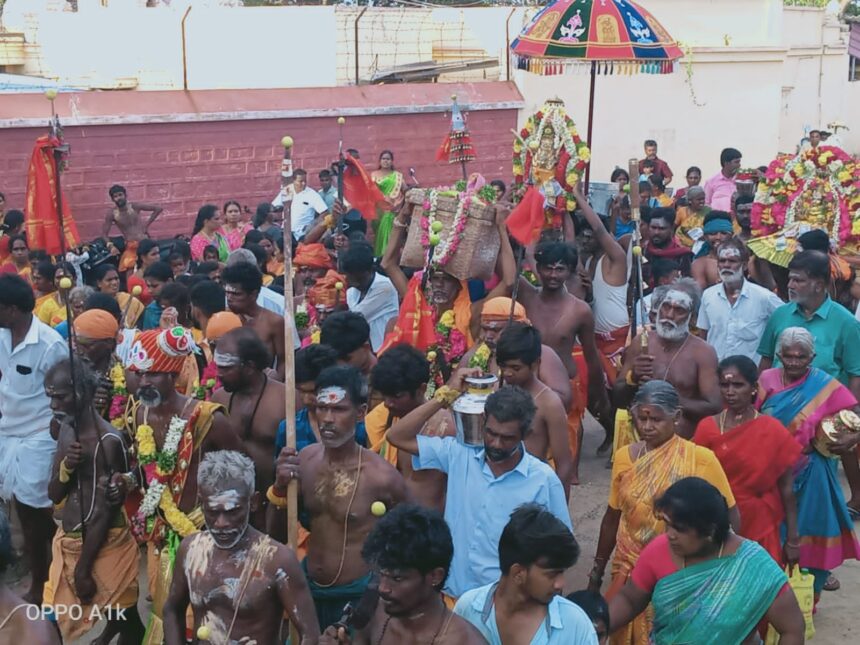 கிருஷ்ணராயபுரம் அருகே மணவாசி கிராமம் கோரகுத்தியில் அமைந்துள்ள ஸ்ரீ அங்காள பரமேஸ்வரி கோவில் முப்பூசை திருவிழாவை முன்னிட்டு மாயனூர் காவிரி ஆற்றில் இருந்து சுவாமிகள் கரகம் பாலித்து அழைத்து சென்றனர்.