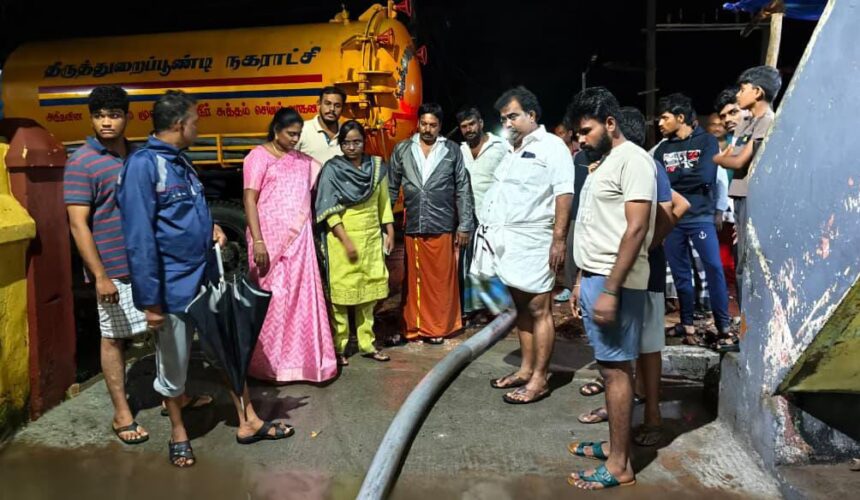 இதன் தொடர்ச்சியாக நேற்றிரவு திருத்துறைப்பூண்டி நகர் பகுதியில் உள்ள வானகார தெருவில் 15-க்கும் மேற்பட்ட வீடுகளுக்குள் மழைநீர் புகுந்தது. இதனால் பொதுமக்கள் அவதியடைந்தனர். சம்பவ இடத்திற்கு விரைந்த நகர்மன்ற தலைவர் கவிதாபாண்டியன், நகராட்சி ஆணையர் கிருத்திகா ஜோதி, கவுன்சிலர் தாஜீதீன், சுகாதார ஆய்வாளர் மாரிசாமி உள்ளிட்டோர் துரிதமாக செயல்பட்டு குடியிருப்புகளில் புகுந்த நீரை வெளியேற்றினர். துரித நடவடிக்கை மேற்கொண்ட திருத்துறைப்பூண்டி நகராட்சி நிர்வாகத்தினை பொதுமக்கள் பாராட்டினர்.